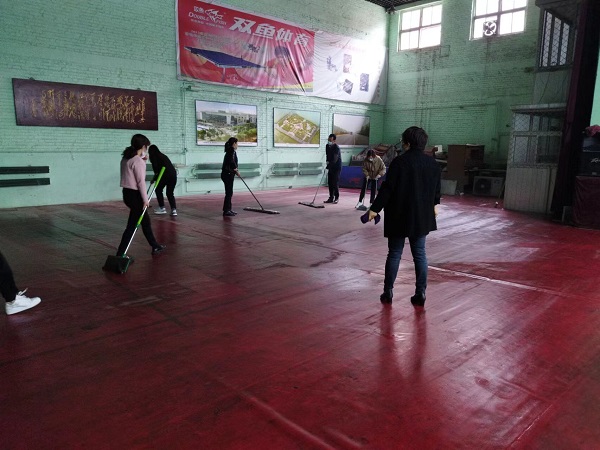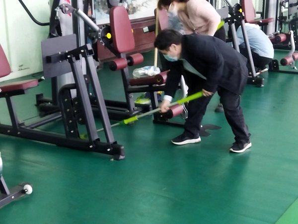 參與活動的20余名同志,分工合作,雖然大家來自不同部門、不同崗位,但爭先恐后、合作默契,清理地面、擦拭健身器材、清潔桌凳。“前面的男同志們加油了,我們快趕上你們了!”負(fù)責(zé)拖地的九分公司主任經(jīng)濟(jì)師劉彩在后面說道?!斑@個乒乓球擋布拿抹布擦拭的效果不太好,用外面的高壓水槍沖洗試試吧!”九分公司主任會計師付世芳一邊用抹布擦拭擋布一邊提出自己的合理化建議,“這個辦法好!”九分公司綜合辦公室主任張路平同意道。