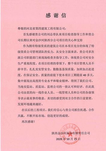 10月22日,四分公司收到陜西金沙河項目部業(yè)主單位致公司的感謝信和錦旗,以及武功縣住房和城鄉(xiāng)建設(shè)局、監(jiān)理單位贈送的錦旗。