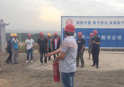 項(xiàng)目部即將進(jìn)行墊層混凝土澆筑施工,現(xiàn)場(chǎng)有大量的木模板、油漆等易燃品,正值高溫季節(jié),火災(zāi)隱患較大。項(xiàng)目部結(jié)合現(xiàn)場(chǎng)實(shí)際組織了本次消防演練,演練分為消防知識(shí)培訓(xùn)和火災(zāi)事故演練兩部分。演練前項(xiàng)目經(jīng)理李宏偉通報(bào)了溫嶺槽罐車爆炸事故造成的嚴(yán)重后果,闡明本次演練的目的和意義。隨后項(xiàng)目部安全員王東春對(duì)滅火常識(shí)、火災(zāi)逃生方法、滅火器如何使用等進(jìn)行了講解,并演示了手提式干粉滅火器的具體使用方法,參與演練的人員親自體驗(yàn)了滅火器的使用。