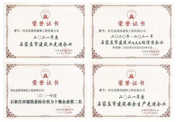 近日,公司在建筑施工領(lǐng)域再獲表彰。經(jīng)專家組嚴格評審,石家莊市建筑協(xié)會研究決定,授予公司2021年度“石家莊市建筑業(yè)綜合實力十強企業(yè)”“石家莊市建筑業(yè)AAA級信用企業(yè)”“石家莊市建筑業(yè)先進企業(yè)”“安全生產(chǎn)先進企業(yè)”,四項榮譽在獲獎榜單中均名列前茅。同時,張新煜被評為“優(yōu)秀企業(yè)經(jīng)理”、梁復(fù)被評為“優(yōu)秀安全總監(jiān)”、陳增順被評為“優(yōu)秀總工程師”、李青等22人被評為“優(yōu)秀項目經(jīng)理”,聶玉朝等2人被評為“安全生產(chǎn)先進工作者”。