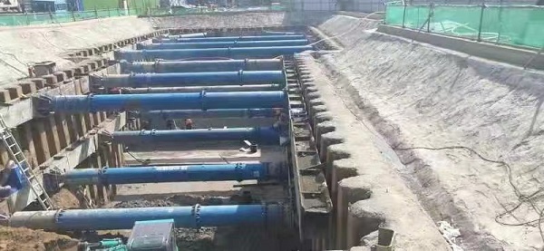 該工程于今年5月中旬開始施工,項目部提前編制了專項施工方案,并經(jīng)過專家論證。5月25日基坑開挖,項目部弘揚工匠精神,基坑圍護根據(jù)方案及現(xiàn)場環(huán)境采用拉森鋼板樁支護,轉(zhuǎn)角部位水泥樁加固支護。開挖土方至1.5米,設置第一道支撐,采用直徑609毫米×14毫米鋼管作為對撐或斜撐。開挖至坑底,墊層施工、支護樁之間設置第二道支撐,坡頂采用鋼筋網(wǎng)固定,噴射細石混凝土。基坑邊砌筑擋水墻,設置排水溝。指定第三方檢測單位進行每日變形監(jiān)測。