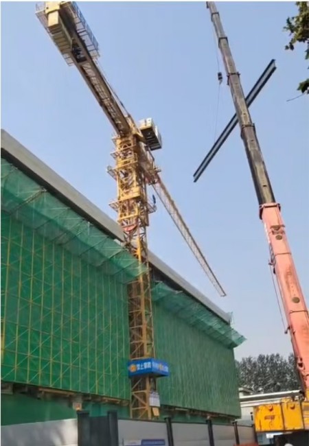 “大臂往右,慢一點(diǎn)……”塔吊下,信號(hào)工通過(guò)對(duì)講機(jī)指揮塔吊緩慢旋轉(zhuǎn)避讓。隨后,負(fù)重吊車精準(zhǔn)、平穩(wěn)地將鋼梁吊裝到施工區(qū)。